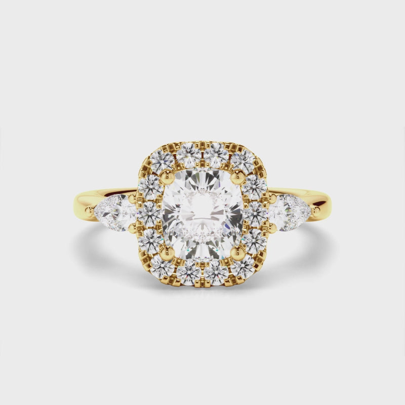 Cushion Cut Diamond Halo Trilogy Engagement Ring with Pear Sides