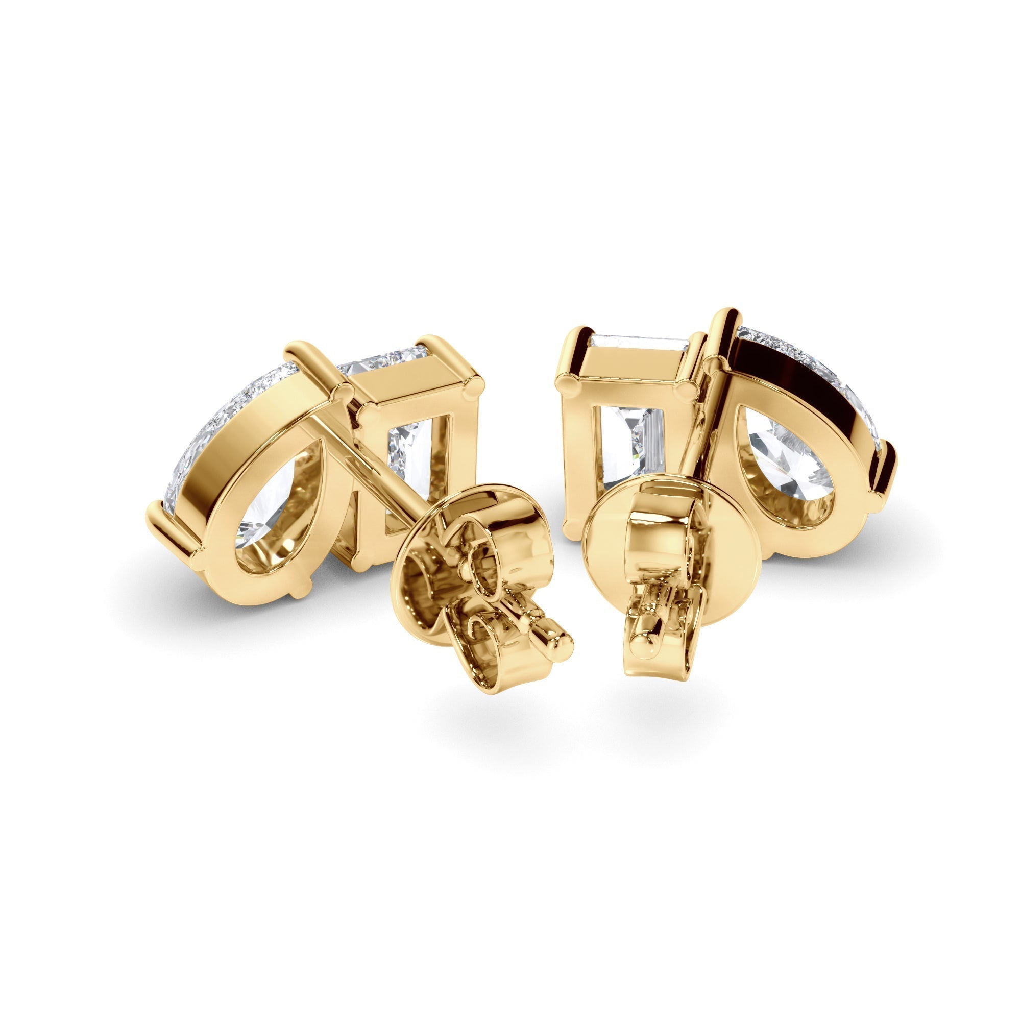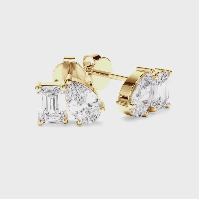 This stunning pair of Toi et Moi diamond stud earrings feature a 0.50ct Emerald Cut Diamond paired with a 0.50ct Pear Cut Diamond over each ear. Exuding fluidity in its line work, and boasting an elegant silhouette, as with all the pieces in our Bespoke Collection, this piece is made especially for you.