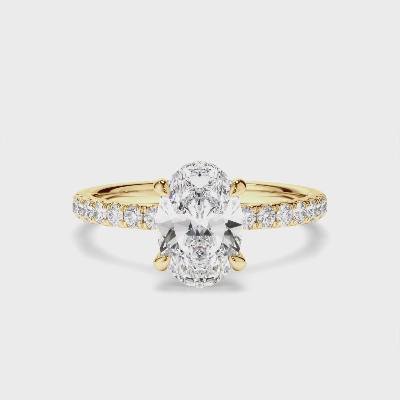 This timeless custom-made oval cut diamond engagement ring, made with your choice of diamond centre stone, features a hidden halo of diamonds and a half band of pave diamonds. Exuding fluidity in its line work, and boasting an elegant silhouette, as with all the pieces in our Bespoke Collection, this piece is made especially for you.