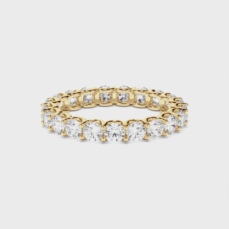 This stunning custom-made eternity ring features a full band of round brilliant cut diamonds set on an 18ct gold or platinum band. Exuding fluidity in its line work, and boasting an elegant silhouette, as with all the pieces in our Bespoke Collection, this piece is made especially for you.